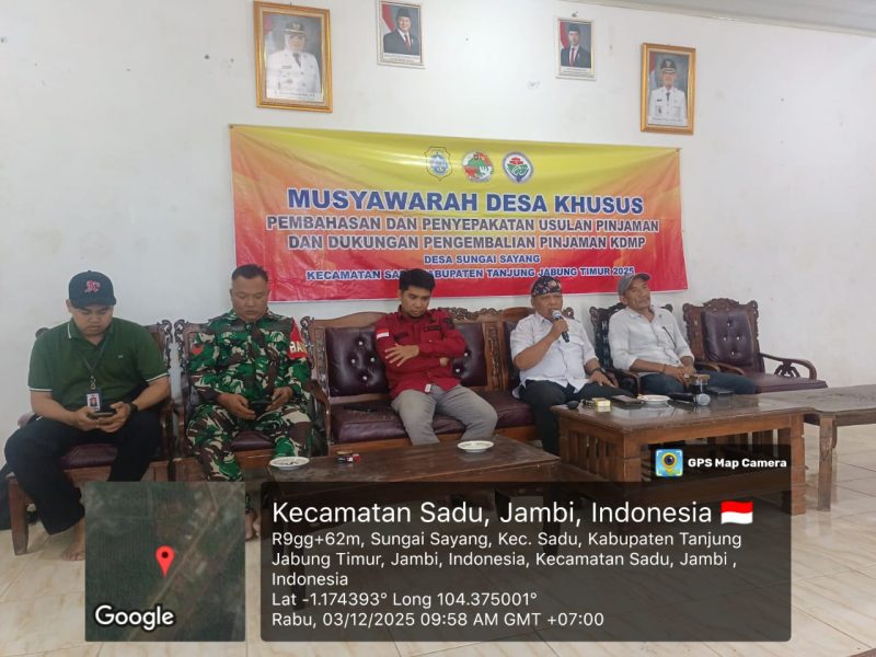 Kuala Tungkal, Kodimtanjab.com – Dalam rangka mendukung penguatan ekonomi kerakyatan, Babinsa Koramil 419-04/Nipah Panjang, Kopka Timur Yono, menghadiri dan mendampingi kegiatan Musyawarah Desa (Musdes) Khusus di Desa Sungai Sayang, Kecamatan Sadu, Kabupaten Tanjung Jabung Timur, pada Rabu (3/12/25). Musdes yang membahas kesepakatan pinjaman dan dukungan pembelian Koperasi Merah Putih ini berlangsung mulai pukul 10.00 WIB di Aula Desa setempat.