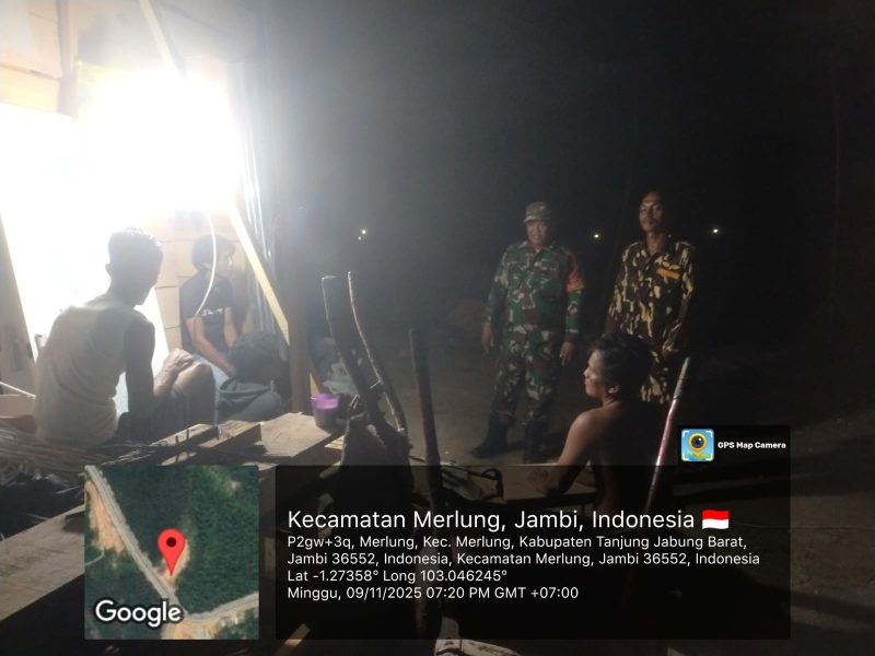 Kuala Tungkal, Kodimtanjab.com – Babinsa Koramil 419-07/Merlung, Serda Yohendri melaksanakan patroli malam bersama Ormas Banser dan warga di Kelurahan Merlung, Kecamatan Merlung, pada Minggu malam (9/11/2025) sekitar pukul 19.20 WIB.