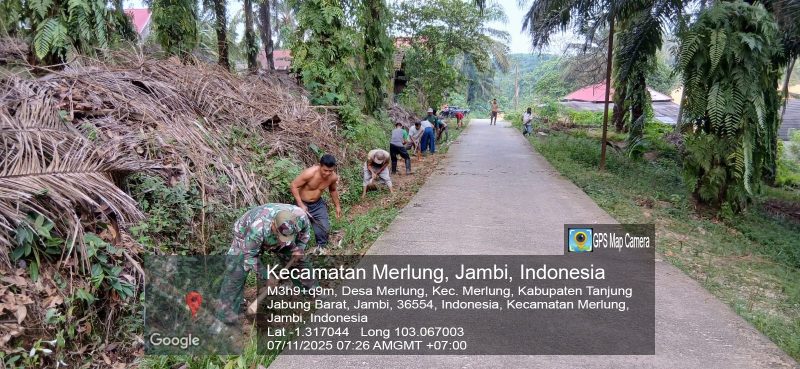 Kuala Tungkal, Kodimtanjab.com – Babinsa Koramil 419-07/Merlung, Serma Redho Harnas melaksanakan kegiatan karya bakti bersama masyarakat di Jalan RT 05 Dusun II, Desa Pinang Gading, Kecamatan Merlung, pada Jumat (7/11/2025) mulai pukul 08.45 WIB hingga selesai. Kegiatan ini menjadi bagian dari pembinaan teritorial sekaligus upaya mempererat budaya gotong royong antara TNI dan masyarakat.