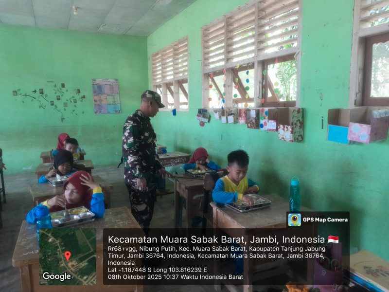 Kuala Tungkal, Kodimtanjab.com – Babinsa Koramil 419-01/Muara Sabak melaksanakan kegiatan monitoring penyaluran dapur Makan Bergizi Gratis (MBG) untuk anak sekolah di beberapa kelurahan wilayah Kecamatan Muara Sabak Barat dan Muara Sabak Timur, Kabupaten Tanjung Jabung Timur, pada Rabu (9/10/2025).