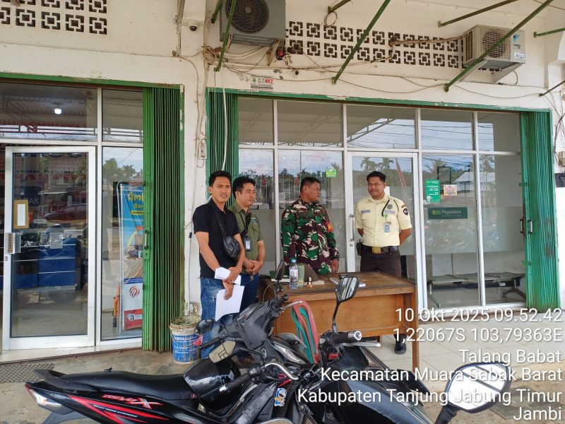 Kuala Tungkal, Kodimtanjab.com – Babinsa Koramil 419-01/Muara Sabak, Sertu Mujais Afarius, melaksanakan kegiatan Komunikasi Sosial (Komsos) bersama karyawan dan security di Kantor Pegadaian Kelurahan Talang Babat, Kecamatan Muara Sabak Barat, pada Jumat (10/10/2025). Kegiatan ini berlangsung dalam suasana hangat dan penuh keakraban.